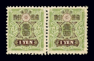 1773 nh 145 image#145, 1914 1Y Yellow green and maroon, old die, watermarked zigzag lines, line perforated 12, fresh mint horizontal pair., rich deep colors, well centered, o.g., n.h., very fine (JSCA #157; Y90,000+). (Image) for hinged $280.00+