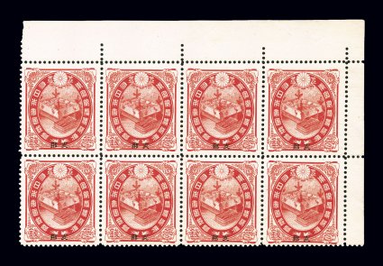 1842 og/nhbl 19 var. image#19 var., 1900 3s Royal Wedding with China overprint, perforated 12 1/2, impressive top right corner block of eight (4x2), beautifully centered, bright rose color on fresh paper, clean o.g., never hinged except for tiny thin in bottom left stamp, otherwise very fine-extremely fine; this issue comes in two perforations, this being the scarcer which is valued at nearly twice the more common, and particularly scarce in this desirable multiple (JSCA #OC19a: Y170,000). (Image) for hinged $208.00+