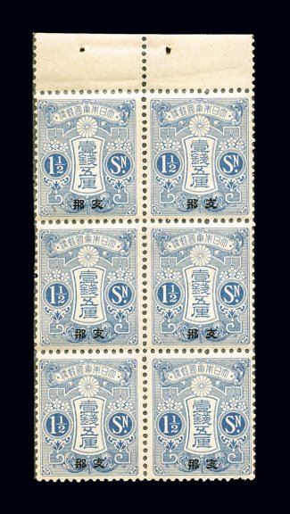 1844 nhBP JSCA #OBP6 imageJSCA #OBP6, 1913 1 1/2s Blue with China overprint, unwatermarked, handmade booklet pane of six, especially well centered, fresh and crisp with full even perforations all around, includes interleaving that is attached to the edge of the selvage as usual, o.g., n.h., extremely fine; an exceptionally rare booklet pane in remarkably choice condition; catalog value is for a hinged pane (Scott #24 var.) (Image) JSCA 150,000Y