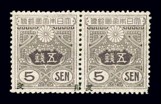 1848 nh 39 var. image#39 var., 1914 5Y Violet with China overprint, watermarked, shifted and split overprint with the perforations between the two characters so that the right character is in the bottom left corner and the left character is in the bottom right corner, marvelously well centered horizontal pair, beautifully fresh with nice color on bright paper, o.g., n.h., extremely fine; an incredibly rare unlisted overprint variety in superlative condition (JSCA #OC41 var.). (Image) Est. 750-1,000