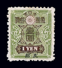 1849 nh 47 image#47, 1918 1Y Yellow green and Maroon with China overprint, watermarked, a wonderfully well centered mint single, with large margins all around, rough perforation 12 with full perforations, strong colors and fresh, o.g., n.h., extremely fine; a very elusive stamp in this premium condition (JSCA #OC49; Y35,000). (Image) for hinged $140.00