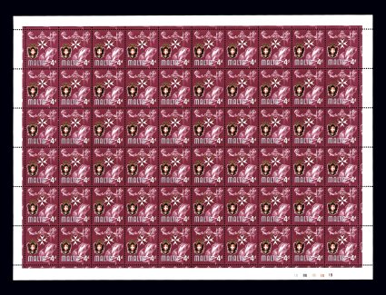 1852 nhbl S.G. #336a imageS.G. #336a, 4p Coat of Arms, silver "Knights of Malta" omitted, a full sheet 60 of this missing color error, being plate 1B with that number for five colors at bottom right, fresh and attractive, o.g., n.h., extremely fine; the silver color was applied by two different plates, one that applied the inscription "Knights of Malta" and the other that applied the country name "Malta", the silver omitted variety comes for each of these, this being the former, Scott does not make the distinction in its listing; a rare sheet that is probably the only one yet intact (Scott #318b var.). (imagea) (Image) S.G. £3,000+