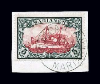 1854 O 29 image#29, 1901 5M Slate and carmine, neatly tied to piece by full strike of "Saipan/Marianen/13 6 06" c.d.s., bright colors, very fine; signed Kosack (Michel #19; €600). (Image) $400.00