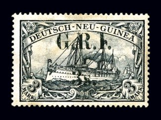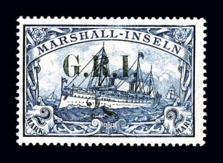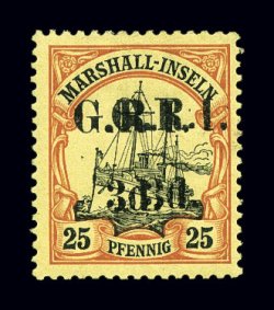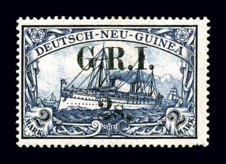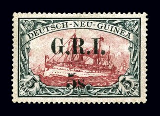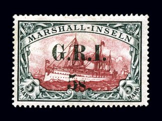 1864 og 29C image#29C, 1914 5/- on 5M Slate and carmine, wide 5 1/2mm spacing, Gibbs second setting, position 2, beautifully centered mint example of this incredibly rare high value, intense brilliant colors, o.g., extremely fine; this is by far the rarest of the regularly issued, non-error stamps of New Britain, only 30-35 5M stamps total of both spacings were believed to have been issued, in addition this is clearly from position 2 of the second setting with a deformed period after the "G" and interestingly a strongly impressed large round period after "I"; Gibbs considers the reported issuance of only seventeen 5M stamps being surcharged of both spacings from settings 1 and 2 to be correct making this an incredible rarity beyond its already rare status, and to be in such impressive condition as well is even more phenomenal; signed Champion, Friedl and H. Bloch, plus accompanied by a 1960 Friedl certificate (S.G. #30; £18,000). (Image) $25,000.00