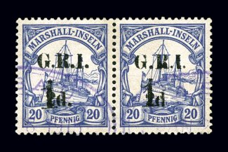 1873 O 45, 45 var. image#45, 45 var. , 1915 "1" on 2p on 20 pf Ultramarine, variety without period after "d", Gibbs second setting, positions 4-5, a handsome used horizontal pair of this very rare twice surcharged issue, the variety being the right stamp, wonderfully well centered and surrounded by full even perforations, brilliant color on fresh white paper, light violet Rabaul oval cancels, extremely fine; exceptionally rare with only 50 stamps originally printed and only five of the variety were issued (one mint example and four used examples being accounted for); signed H. Bloch and accompanied by a 1962 Friedl certificate (S.G. #64, 64a; £5,250). (Image) $4,000.00+