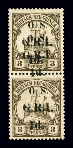 1874 og O1, O1a image#O1, O1a, 1915 1p on 3pf Brown official, double surcharge, vertical pair with variety on the top stamp, Gibbs third setting, position 7 of rows nine and ten, fresh and well centered from the only two rows that this error comes from, full o.g., lightly hinged, very fine; this extremely rare variety was caused by an extra row of surcharges being applied between the ninth and tenth rows of one sheet, all known examples are vertical pairs of these two rows, only ten pairs were issued, one of these (position 8) shows the spaced "1" and "d", Gibbs knew of only seven of the other positions, this position being unknown to him; signed H. Bloch and accompanied by a 1962 Friedl certificate (S.G. #O1, O1a; £2,276). (Image) $2,025.00