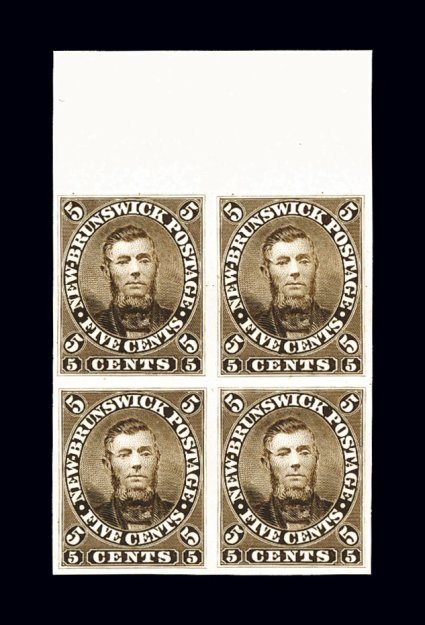1877 P 5P image#5P, 1860 5c Brown Connell, plate proof on India on original card, top margin block of four, extraordinarily fresh and crisp, exceedingly deep color and razor-sharp impression, extremely fine; a very pretty and scarce position piece; not listed in Unitrade. (Image) Est. 500-750