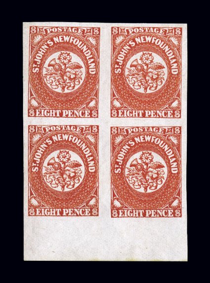 1878 og/nhbl 8 image#8, 1857 8p Scarlet vermilion, a most impressive bottom sheet-margin block of four, other three margins large and even, deep vibrant color and a well incised impression, o.g., top stamps never hinged, bottom stamps lightly hinged, extremely fine; blocks are seldom encountered and are especially rare in this fabulous quality; cataloged as four singles (Unitrade C$3,600.00+). (Image) $1,050.00+