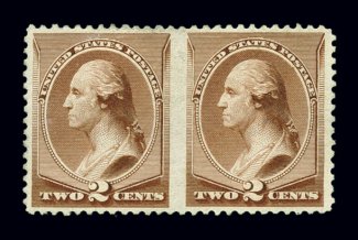 643 og 211Bc image#211Bc, 2c Pale red brown special printing, horizontal pair, imperforate between, exceptionally well centered, rich fresh color, o.g., lightly hinged, tiny trace of a picked-out inclusion on left stamp, otherwise choice very fine; a rare classic error; clear 1979 PF certificate. (Image) $1,900.00
