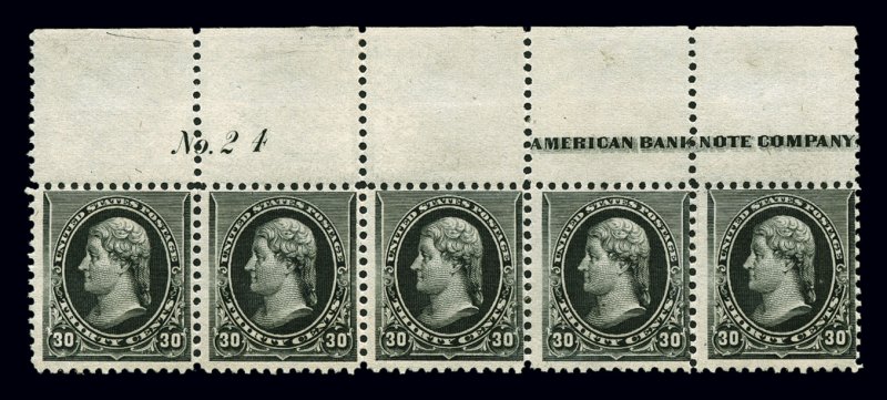 657 og/nh 228 image#228, 30c Black, top margin imprint and plate "No. 24" strip of five, o.g., right three stamps n.h., left stamp with tear at bottom, faint ink mark at top left of selvage, fine appearance and a scarce imprint strip. (imagea) (Image) as singles $4,300.00
