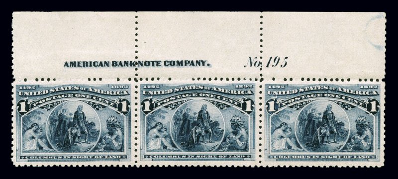 660 nh 230 image#230, 1c Columbian, remarkably choice full top margin imprint and plate "No. 195" strip of three, incredibly fresh, with especially deep luxuriant color and impression, wonderfully well centered, o.g., n.h., extremely fine; catalog value is for three never hinged singles; 1989 and 2001 PF certificates. (imagea) (Image) $150.00+