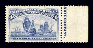 661 og 233 image#233, 4c Columbian, right sheet-margin partial imprint single, exceptionally well centered within incredibly large margins, rich luxuriant color, o.g., barest trace of hinging, extremely fine. (Image) $87.50