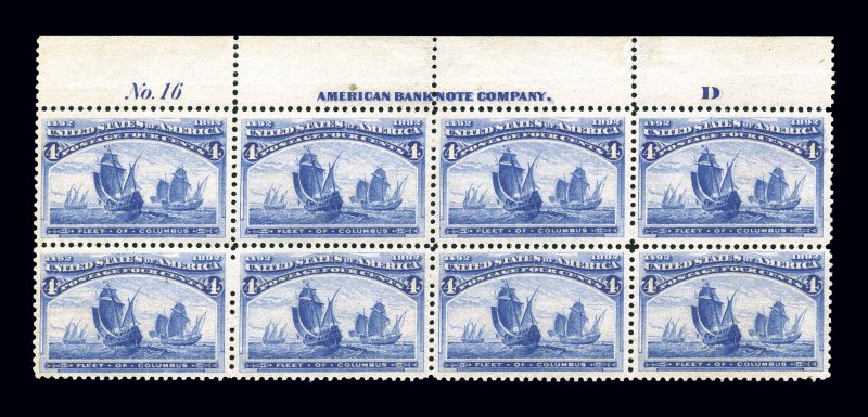 663 nhPB 233 image#233, 4c Columbian, top margin letter "D", imprint and plate "No. 18" block of eight, fabulously well centered for a plate block, with each stamp possessing large and well balanced margins, strikingly intense rich color, overall strong and intact perforations with just a few rejoined perfs. in the selvage, pristine o.g., n.h., extremely fine; a premium quality plate block of this early commemorative. (imagea) (Image) $3,750.00