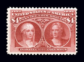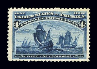 676 nh 244 image#244, $4.00 Columbian, a notably fresh mint example of this popular commemorative, with rich bright color and a strong clean impression on crisp white paper, full o.g. which has never been hinged, nearly very fine; truly never hinged examples of this high value are especially scarce; 1979 PF and 2004 PSE certificates. (Image) $8,000.00