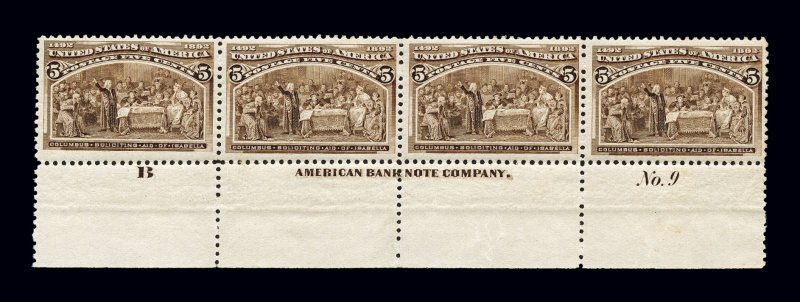 665 nh 234 image#234, 5c Columbian, full bottom margin imprint, letter "B" and plate "No. 9" strip of four, "post office" fresh, lovely rich color, overall quite well centered, o.g., n.h., very fine; catalog value is for four never hinged singles. (imagea) (Image) $880.00+