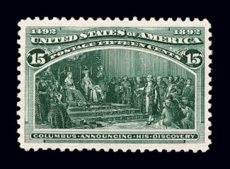 670 nh 238 image#238, 15c Columbian, a fabulous quality mint example that is the epitome of a "post office" fresh gem, possessing flawless centering amid extravagantly large margins which are most atypical of this value, brilliantly fresh as well, with sumptuously rich color and a deeply etched impression, immaculate o.g., never hinged, extremely fine; a superb stamp that is destined to realize an impressive price; 1990 and 2001 PF certificates; ex-Floyd. (Image) 625.00