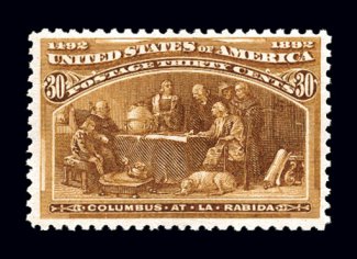 672 nh 239 image#239, 30c Columbian, pristine mint single, possessing marvelously brilliant rich color, unusually fresh and crisp, flawless o.g., never hinged, very fine and exceedingly choice; 1998 PF certificate. (Image) $750.00