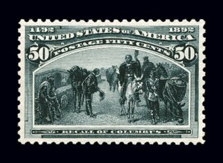 674 og 240 image#240, 50c Columbian, precisely centered within large margins although reperforated at bottom, deep intense color and impression, o.g., lightly hinged, extremely fine appearance; clear 1992 PF certificate and a 2004 PF certificate. (Image) $600.00