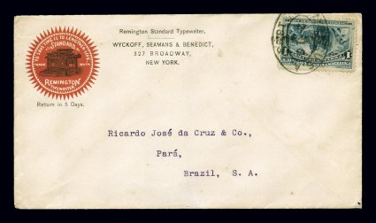 678 c 230 image#230, 1c Columbian, tied by New York, Feb. 10, 1893 double oval on cover to Brazil, with Remington Typewriter illustrated corner card, very fine; a scarce usage paying the 1c printed matter rate. (Image) Est. 150-200