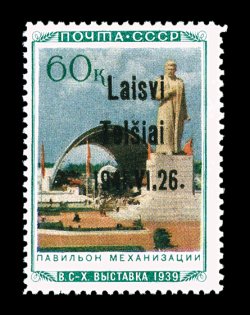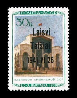 2183 nh Mi. #19III imageMichel #19III, 1941 "Laisvi/Telsiai/1941. VI. 26" overprint on 30K Armenian Pavilion, Ty. III, wonderfully well centered, o.g., n.h., extremely fine; only 360 stamps issued. (Image) €450