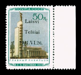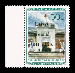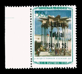 2184 nh Mi. #20I imageMichel #20I, 1941 "Laisvi/Telsiai/1941. VI. 26" overprint on 30K Tadzhik Pavilion, Ty. I, left sheet-margin single, position 19, well centered and fresh, o.g., n.h., very fine; only 360 stamps issued; 1999 Gerhard Krischke BPP certificate (Image) €450