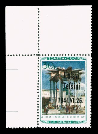 2186 nh Mi. #21IIIk imageMichel #21IIIk, 1941 "Laisvi/Telsiai/1941. VI. 26" overprint on 30K Uzbek Pavilion, Ty. III, broken "l" in "Telsiai" top left corner-margin single, position 1, quite well centered, crisp and attractive, o.g., hinged in the left selvage only, stamp is n.h., very fine; Michel notes that to date this flaw is only known on #18III and is unpriced; very rare and a wonderful item for the specialist. (Image) Est. 500-750