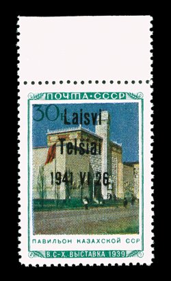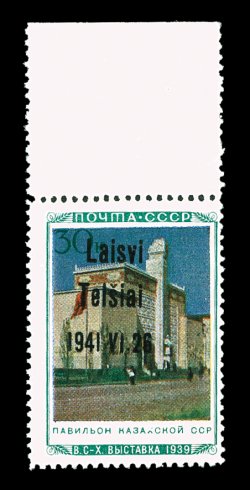 2189 nh Mi. #23III imageMichel #23III, 1941 "Laisvi/Telsiai/1941. VI. 26" overprint on 30K Kazakh Pavilion, Ty. III, top sheet-margin single, bright colors and fresh, o.g., n.h., nearly very fine; only 360 stamps issued; signed Krischke BPP. (Image) €450