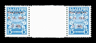 2192 nh Mi. #1Z, 2Z imageMichel #1Z, 2Z, 19411L and 3L Macedonia surcharges on 10s Orange red and 15s Pale blue of Bulgaria respectively, horiz. gutter pairs, "post office" fresh with bright colors on brilliant white paper, quite well centered, pristine o.g., n.h., very fine; the only values that come in gutter pairs and scarce; 2000 Gerhard Krischke BPP certificate. (Image) €900