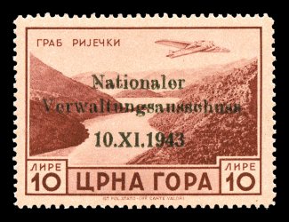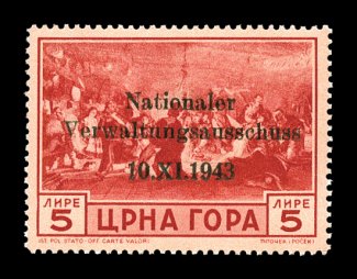 2195 og Mi. #19 imageMichel #19, 1943 National Administrative Committee overprint on 10L Dark carmine on pale orange red air post. the exceptionally rare key value of the German occupation of Montenegro, attractive and extraordinarily well centered example, surrounded by full even perforations, o.g., just the barest trace of hinging, extremely fine; double signed Schlenger BPP and accompanied by 1986 Gerhard Krischke BPP certificate (Scott #3NC5; $1,900.00). (Image) for n.h. €4,400