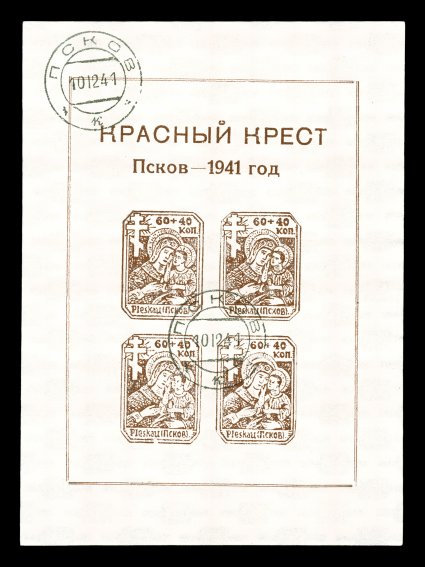 2201 O Mi. Bl. #1Y imageMichel Block #1Y, 1941 60k+40k Dark carmine brown imperforate souvenir sheet, lying watermark, scarce used example with Cyrillic "Pskow/10 12 41" c.d.s. on the stamps as a cancel and in the top margin as a control, extremely fine; despite the equality in catalog value the used sheets are considerably scarcer, especially with the rare lying watermark and comprise a small fraction of the 769 sheets that were issued; 2000 Gerhard Krischke certificate. (Image) €2,500