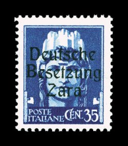 2203 og Mi. #7III imageMichel #7III, 1943 "Deutsche/Besetzung/Zara" overprint on 35c Blue of Italy, Ty. III overprint, mint single, well centered with full clean perforations, fresh with deep color, o.g., very lightly hinged, very fine; the type III overprint is extremely scarce being found on only four positions out of a sheet of 100, Michel states that type III overprints should be given an additional 300% premium over the normal; signed Ludin. (Image) for normal n.h. €340