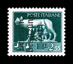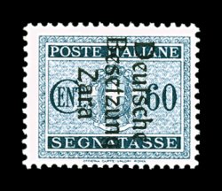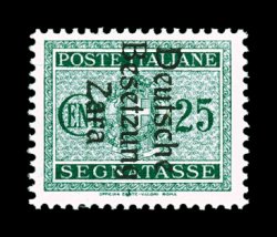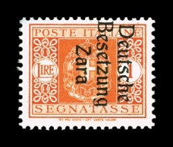 2204 og Mi. #13If imageMichel #13If, 1943 "Deutsche/Besetzung/Zara" overprint on 2.55L of Italy, Ty. I overprint, missing point on last "e" of "Deutsche", attractive mint single with deep color, well centered, o.g., very lightly hinged, very fine; this plate variety is very rare with only 20 stamps originally printed with it, Michel notes that plate flaws should be given an additional 100% premium; double signed Ludin BPP and accompanied by 1982 Emil Ludin BPP certificate as never hinged. (Image) for normal n.h. €400
