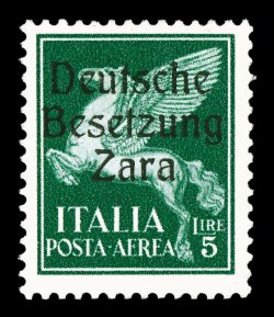 2206 og Mi. #29I imageMichel #29I, 1943 "Deutsche/Besetzung/Zara" overprint on 5L Green air post of Italy, Ty. I overprint, select mint single of this air post rarity, being well centered and possessing full even perforations all around, intense deep yellow green color on bright paper, o.g., relatively lightly hinged, a very fine and highly desirable example of this major air post rarity; only 130 stamps were originally produced; signed A. Diena, Ludin BPP and accompanied by 1989 Emil Ludin BPP certificate. (Image) for n.h €10,000