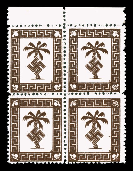 2209 nhbl Mi. #5a imageMichel #5a, 1943 Dark brown North Africa Feldpost Admission stamp, top sheet-margin block of four, excellent deep color in one of the darker shades of this issue, with sharp impression, remarkably fresh with full o.g., n.h. but bottom right stamp has a slight dull spot on the gum (fingerprint), very fine; these "stamps" were issued to the North African troupes and permitted the soldier to send a package or letter back home, exceptionally scarce in multiples in this select condition; pencil signature and plating numbers on each stamp and accompanied by 1995 Hanfried Muller BPP certificate. (Image) €2,800+