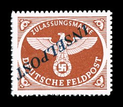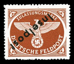 2219 og Mi. #10Ad imageMichel #10Ad, 1944 "INSELPOST" diagonal overprint in black blue on Bright red brown feldpost stamp, perforated, plate I, attractive mint single of this scarce printing on the perforated feldpost stamps, fresh strong and characteristic colors on bright paper, o.g., lightly hinged and fingerprint on the gum, extremely fine; this printing is scarce either rouletted or perforated but especially so perforated in such choice condition; signed Pickenpack and accompanied by 1994 Gustav Mogler BPP certificate. (Image) for n.h. €2,200