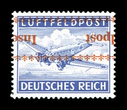 2212 nh Mi. #6K imageMichel #6K, 1944 "Inselpost" diagonal overprint on Bright red brown feldpost stamp, inverted overprint, a marvelously fresh example of this extremely rare overprint error, especially bright and attractive colors on brilliantly white paper, pristine o.g., never hinged, extremely fine; this error is probably one of just a very few that are still in existence and is quite likely much rarer than the modest premium given over the normal variety; signed Rungas BPP and accompanied by 1998 Hanfried Muller BPP certificate. (Image) €2,400