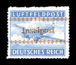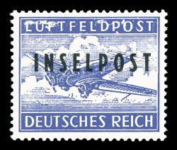 2217 og Mi. #8A imageMichel #8A, 1944 "INSELPOST" horiz. overprint on Violet ultramarine air feldpost stamp, perforated, well centered single of this rarity, with fresh rich color, plus full even perforations all around, full o.g. that has never been hinged, but has some color adherence from the stacking of the sheets before the ink had completely dried, this adherence has also caused some color loss to the face of the stamp, mostly in the top label, from the sheet above, despite this manufacturing or storage problem this is yet quite an attractive and desirable example of the rarest of the feldpost stamps as most of this issue were rouletted, not perforated; 1982 Gustav Mogler BPP certificate. (Image) for n.h. €15,000