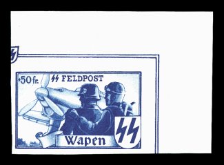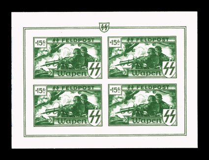2162 ng Mi. #XVIB var. imageMichel #XVIB var., 1943 Flemish Legion +15Fr SS Feldpost, imperforate, miniature of sheet of four, issued ungummed and with an impression of the +50Fr miniature sheet on the reverse, tiny and trivial corner crease at bottom right, extremely fine and scarce unlisted variety; 1999 Gerhard Krischke certificate. (Image) Est. 200-300