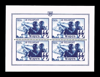 2163 nhbl Mi. #XVII var. imageMichel #XVII var., 1943 Flemish Legion +50Fr SS Feldpost miniature sheet of four, perforated horizontally between the two pairs, with all the other perforations omitted, fresh with full o.g., n.h., extremely fine; a scarce unlisted variety; 1999 Gerhard Krischke certificate. (Image) Est. 400-500