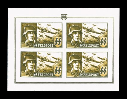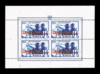 2165 nhbl Mi. #XXA imageMichel #XXA, 1943 Flemish Legion +50Fr SS Feldpost with "Langemark" overprint, perforated miniature sheet of four, fresh and bright, o.g., n.h., very fine. (Image) €600