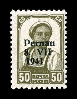 2168 og Mi. #5I-10I imageMichel #5I-10I, 1941 "Pernau/8. VII/1941" overprints on 5k-50k Russian definitives, Ty. I, the the six values issued with this scarce type of overprint complete including the scarce 50k Brown, fresh and attractive, o.g., very lightly hinged, overall quite well centered and very fine or better for these; Krischke notes that while 800 stamps were issued in type I of the 50pf, of this small number only a tiny portion yet remain in existence; 1999 Gerhard Krischke BPP certificate. (Image) for n.h. €3,800