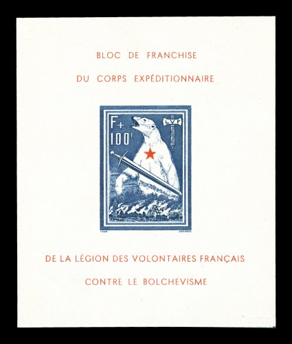 2169 nh Mi. Bl. #IU imageMichel Block #I, 1941 French Volunteer Legion F+100Fr Bear souvenir sheet, imperforate, fresh and handsome example of this popular souvenir sheet, o.g., n.h., extremely fine; decidedly scarce imperforate; signed GPSY, Pickenpack BPP and one other. (Image) €1,800
