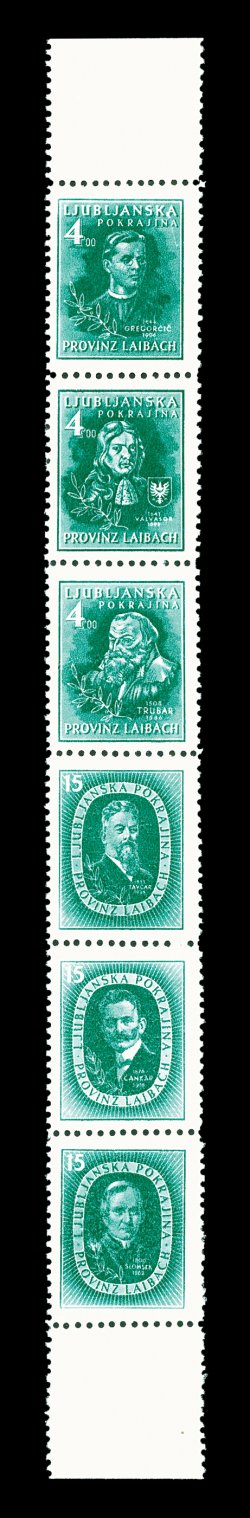 2171 nh Mi. #IA-VIA, IV/IA, V/IA, imageMichel #IA-VIA, IV/IA, V/IA, VI/IA, 1945 4c and 15c Famous Slovenians, unissued set complete in vert. strips of six in all seven colors for a total of 42 different, included are all three plate flaws found on from one to five colors for a total of eight different of the flaws, all are remarkably well centered, fresh bright colors, o.g., stamps all n.h., all strips are fully intact though folded along one or two rows of perforations as always, extremely fine; an exceptionally rare unit that is seldom found complete today; 1999 Gerhard Krischke BPP certificate. (Image) €4,200+