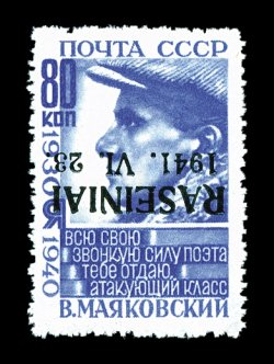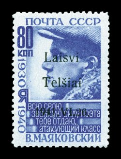 2173 nh Mi. #10K imageMichel #10K, 1941 "Rasseiniai/1941. VI. 23." overprint on 80k Mayakovsky, inverted overprint, beautifully fresh and handsome example of this scarce overprint error, bright ultramarine color, exceptionally well centered, o.g., n.h., extremely fine; double signed Krischke BPP. (Image) €900