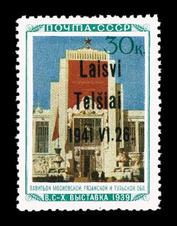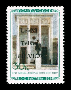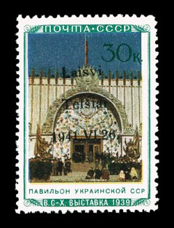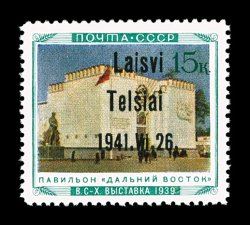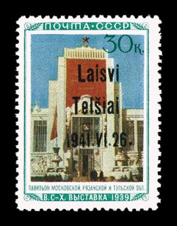 2177 nh Mi. #14III imageMichel #14III, 1941 "Laisvi/Telsiai/1941. VI. 26" overprint on 30K Central Regions Pavilion, Ty. III, bright colors, o.g., n.h., trivial gum bend, very fine; only 360 stamps issued. (Image) €450