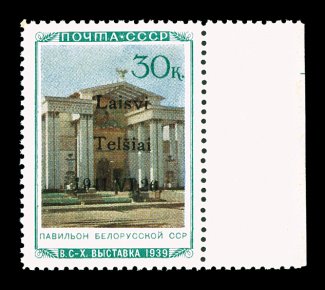 2180 nh Mi. #16I imageMichel #16I, 1941 "Laisvi/Telsiai/1941. VI. 26" overprint on 30K Byelorussian Pavilion, Ty. I, right sheet-margin single, position 30, extraordinarily well centered, o.g., n.h., trivial gum wrinkle, otherwise extremely fine; only 360 stamps issued; clear 1999 Gerhard Krischke BPP certificate. (Image) €450