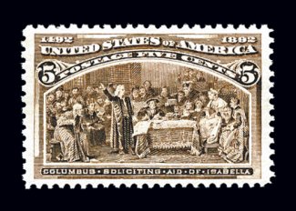 301 nh 234 image#234, 5c Columbian, pristine mint single, exceedingly well centered within extra-wide margins, strong rich color and a sharp detailed impression, o.g., n.h., extremely fine; 1998 PF certificate and a 2005 PSE certificate (XF 90); ex-Jarrett. (Image) $220.00