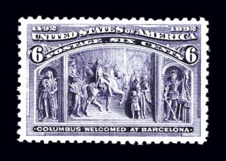 303 nh 235a image#235a, 6c Columbian, the red violet shade, an exceedingly choice mint example of this distinctive color variety, wonderfully well centered amid extravagantly large margins, gorgeous rich color and a highly detailed impression on fresh paper, o.g., n.h., extremely fine; 2000 PF certificate for a block of four, this being the top right stamp. (Image) $195.00