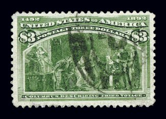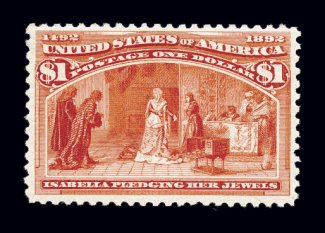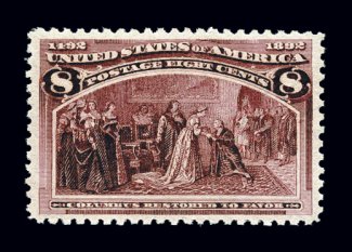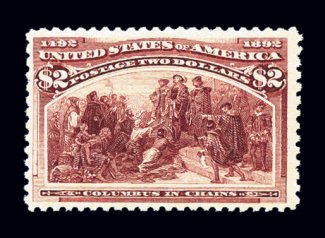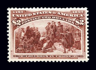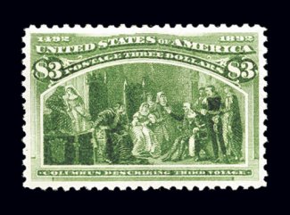 313 og 243 image#243, $3.00 Columbian, a premium quality mint example that possesses exceptional physical attributes, including being virtually perfectly centered within large margins, equally impressive is this stamp's strikingly intense color in a deep shade, plus its impression is prooflike on bright fresh paper, full clean o.g., lightly hinged only once, extremely fine; a gem original gum 1893 Three Dollar Columbian; 1994 PF certificate. (Image) $1,900.00