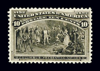 305 nh 237 image#237, 10c Columbian, handsome mint single, possessing an exceptional overall freshness, with deep black brown color and a sharp impression on wonderfully bright paper, particularly well centered, pristine o.g., n.h., extremely fine; 1989 PF certificate and a 2005 PSE certificate (VF-XF 85); ex-Jarrett. (Image) $325.00